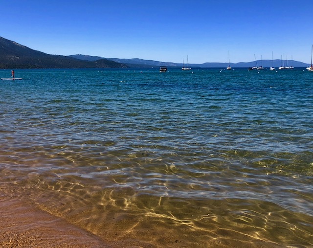 Lake Tahoe is surrounded by forest intermingled with small cities and towns. The sky is usually blue and the water so clear, you can see your feet as you wade into the chilly water from the sandy beach.